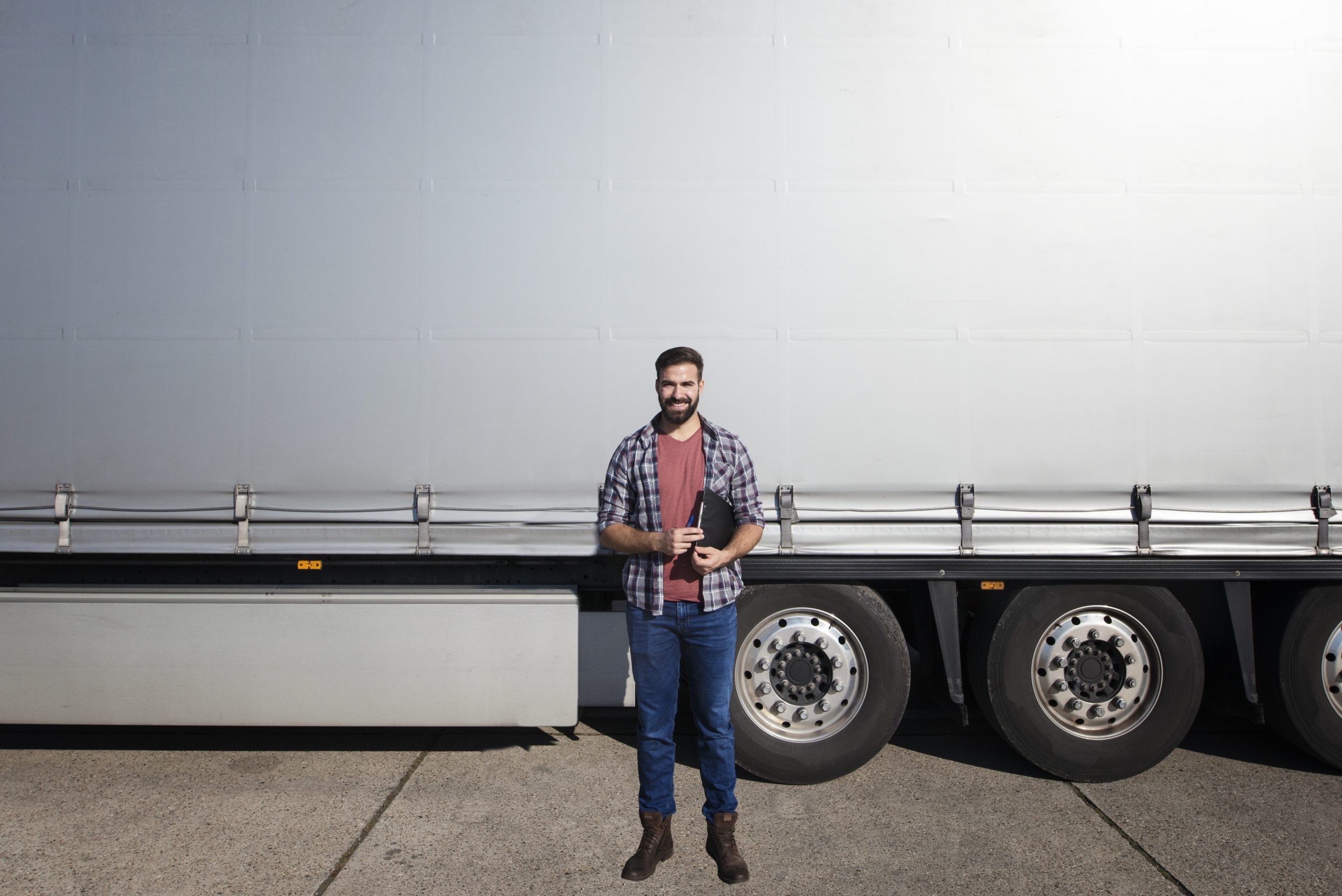 Portrait of middle aged bearded trucker standing in front of truck trailer against grey shiny tarpaulin.